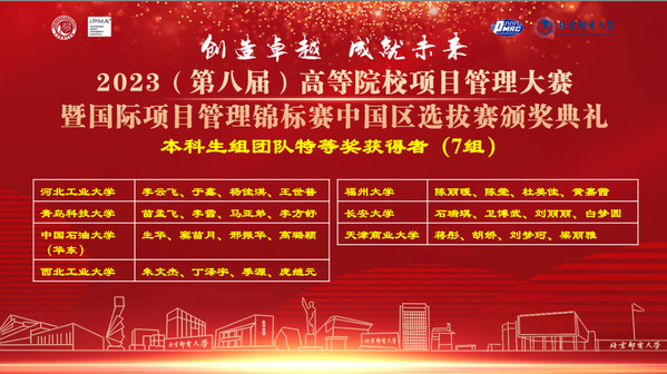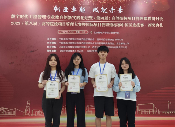 第八届高等院校项目管理大赛暨国际项目管理锦标赛中国赛区选拔赛于5月28日在线上举行,来自清华大学、北京大学、西北工业大学、中国石油大学、bat365正版唯一官网、北京邮电大学等全国各地92所高校的206支代表队,共1063名学生参加了比赛。bat365代表队获本科生组团队特等奖。团队成员共4人,其中2人获本科生组个人一等奖、2人获二等奖。两名指导教师获“优秀指导教师”称号。