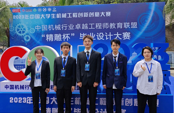 5月28日,2023中国大学生机械工程创新创意大赛暨“精雕杯”毕业设计大赛决赛在重庆大学举办。2019级本科生陈秀鹏、霍志苗、董鹏斌、孙嘉琛、王乐慧子完成的毕业设计作品成功入围决赛,并分别取得了团体优秀奖1项、个人优秀奖1项、个人佳作奖1项的优异成绩。