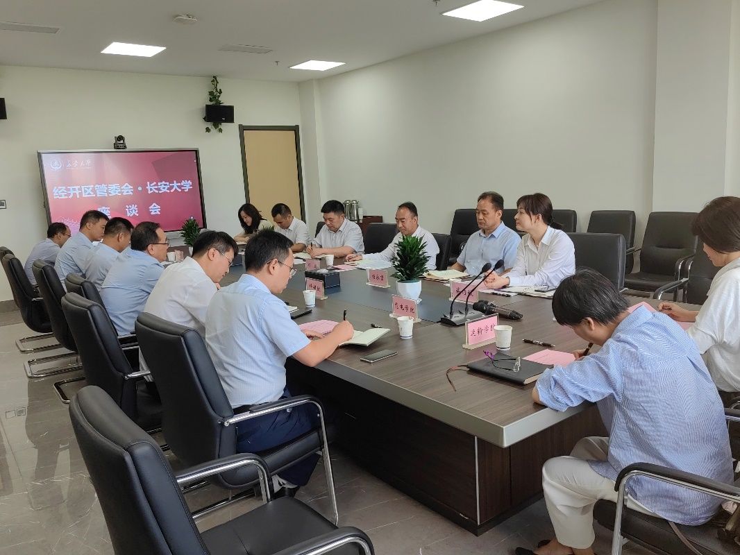 9月14日下午,经开区党工委委员、管委会副主任杨剑一行来校交流,bat365党委常委、副校长王建伟出席座谈会。会议由社会合作处处长杨红斌主持。