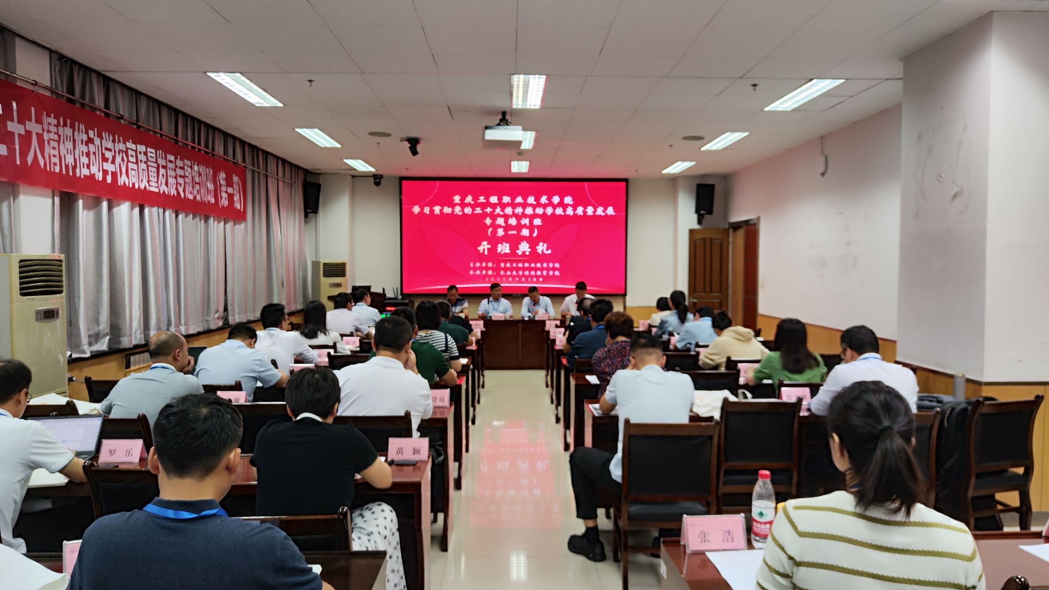 9月18日和10月9日,重庆工程职业技术学院“学习贯彻党的二十大精神 推动学校高质量发展”专题培训班第一期和第二期分别在bat365顺利开班,两期培训分别由重庆工程职业技术学院党委书记易俊、院长张进带队,共80名领导干部参加培训,bat365副校长裴建中出席两期开班仪式。