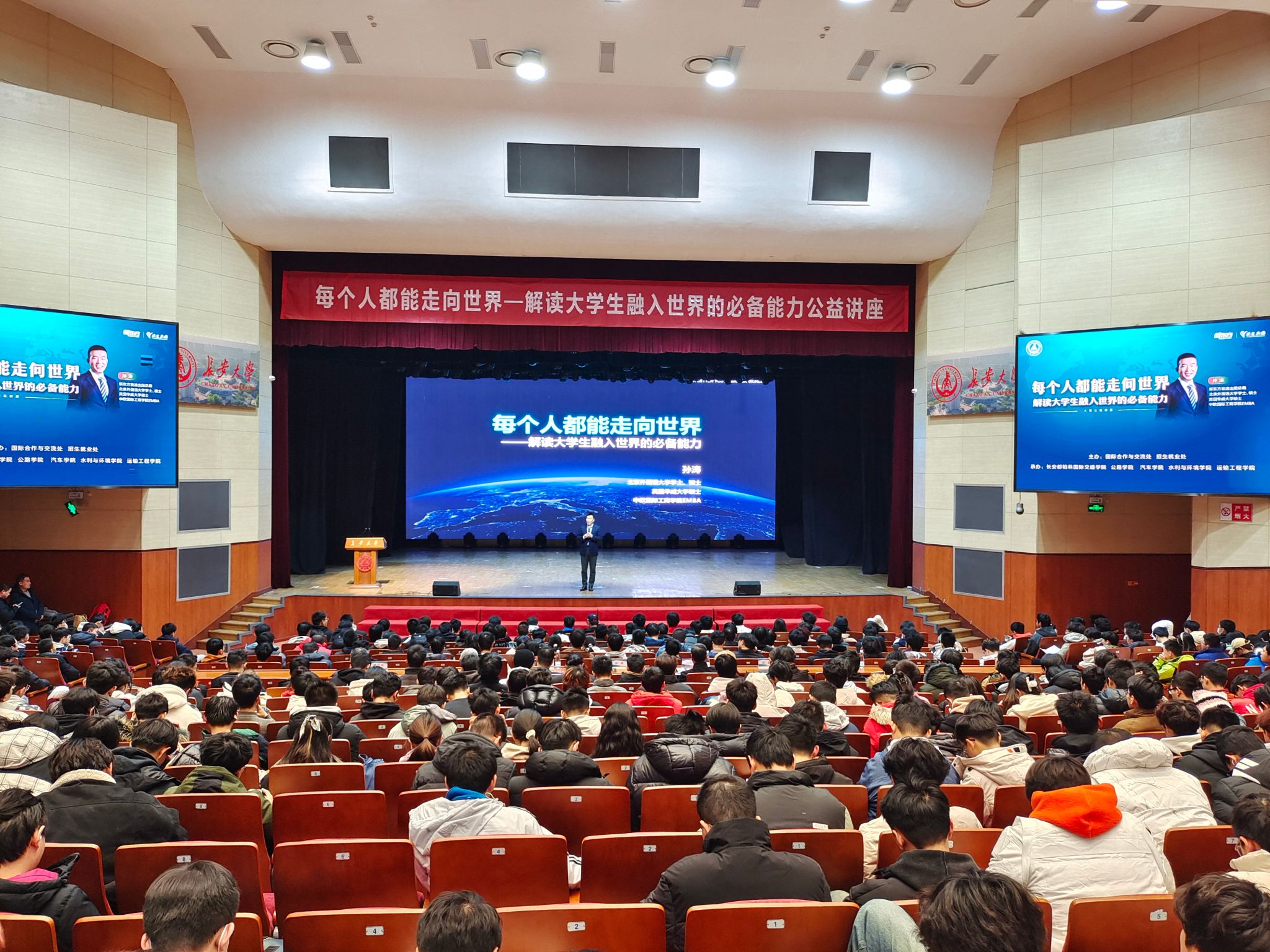 本次活动由学校国际合作与交流处、招生就业处主办,长安都柏林国际交通学院、公路学院、汽车学院、水利与环境学院、运输工程学院联合承办,来自各院(系)的1000余名学生在北校区长安文化艺术中心大礼堂参加讲座。