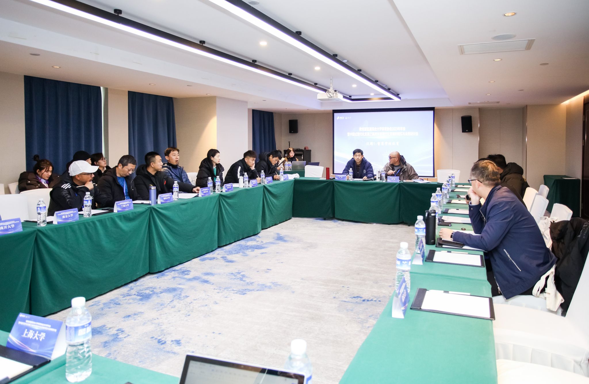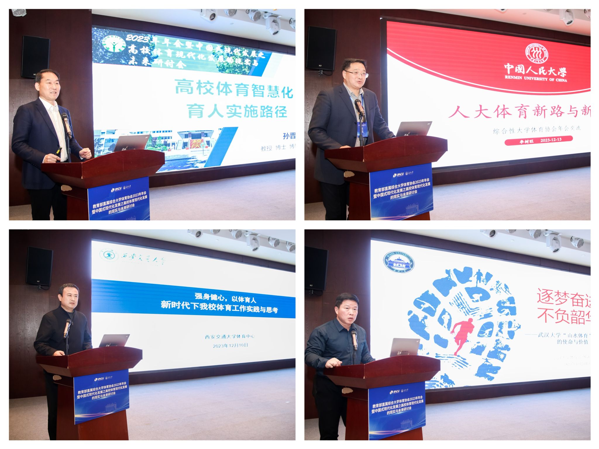 山东大学体育学院院长孙晋海、中国人民大学体育部主任李树旺、西安交通大学体育中心主任刘长江、武汉大学体育部主任罗江波围绕“高校体育现代化发展”的主任进行了多维度的经验分享与交流。
