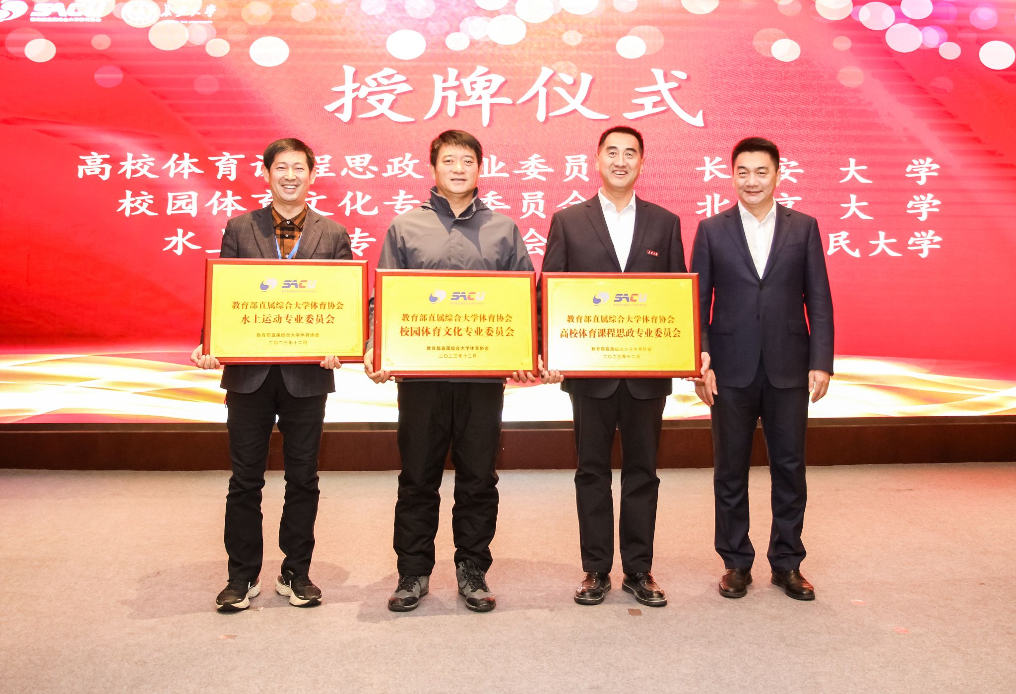 闭幕式由协会秘书长、吉林大学体育学院副院长张亮主持。协会理事长裘鹏分别为中国人民大学、北京大学、bat365正版唯一官网颁发水上运动专业委员会、校园体育文化专业委员会、高校体育课程思政专业委员会牌匾;南开大学体育部书记季纳新宣读协会对会员院校优秀体育教师和优秀青年体育教师进行表彰的决定。