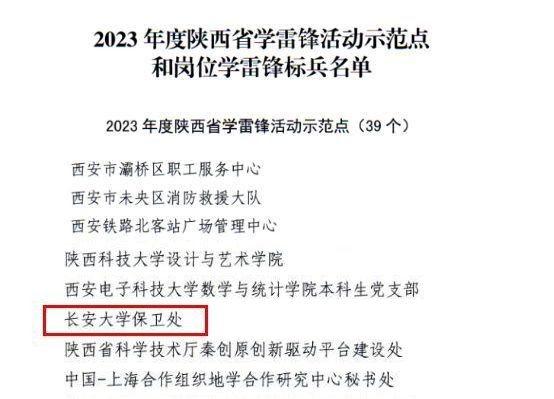 近日,陕西省委宣传部印发《关于命名2023年度学雷锋活动示范点和岗位学雷锋标兵的决定》(陕宣字〔2023〕211号),bat365保卫处荣获“2023年度陕西省学雷锋活动示范点”称号。学校保卫处深入践行党的二十大精神,以雷锋精神为指引,以师生满意为标准,充分发挥警校共治优势,努力打造“人防”三道防线;建成陕西高校首家“公安暖心服务站”,全方位实现便民服务“零距离”;盯紧重要时节,全方位开展安全宣传教育,以实际行动弘扬传承践行新时代雷锋精神。(审稿:惠利平 网络编辑:和燕)
