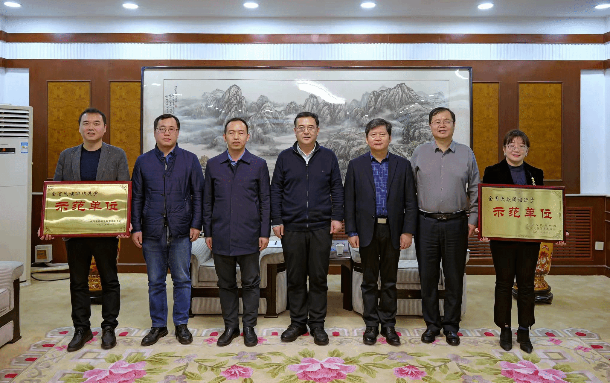 王晓斐向学校授予“全国民族团结进步示范单位”“全省民族团结进步示范单位”牌匾。
