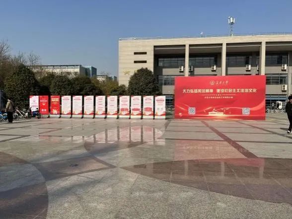 营造浓厚的宪法学习氛围。通过电子屏幕播放宪法宣传视频、在校园悬挂横幅标语、在图书馆广场和树蕙园广场设立宣传桁架和展板、向师生发放“宪法宣传册”等方式在全校范围内营造全方位、多层次、深维度的学习氛围。