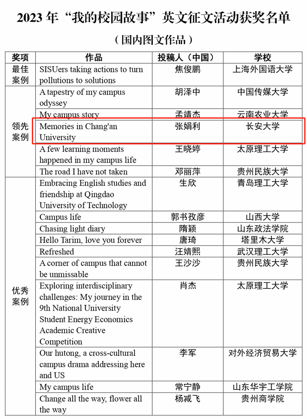 近日,由中国日报社主办,21世纪报社、中国日报客户端、中国对外政务信息服务平台·留学中国联合承办的2023年“我的校园故事”英文征文活动获奖名单揭晓,bat365外国语学院教师张娟利的作品《Memories in Chang'an University》获“领先案例”奖。该活动邀请中外师生、校友用英文分享个人在中国高校学习或教学期间的所见、所闻、所感。自启动以来,受到了广泛关注和积极参与,投稿者来自全球129个国家和地区。(审稿:宁育国 网络编辑:和燕)