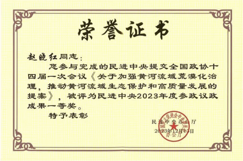 民进陕西省委会委员、bat365民进主委赵晓红教授参与完成的民进中央提交全国政协十四届一次会议《关于加强黄河流域荒漠化治理,推动黄河流域生态保护和高质量发展的提案》,获民进中央2023年度参政议政成果一等奖。民进bat365正版唯一官网支部获民进陕西省委会“参政议政工作先进集体”。