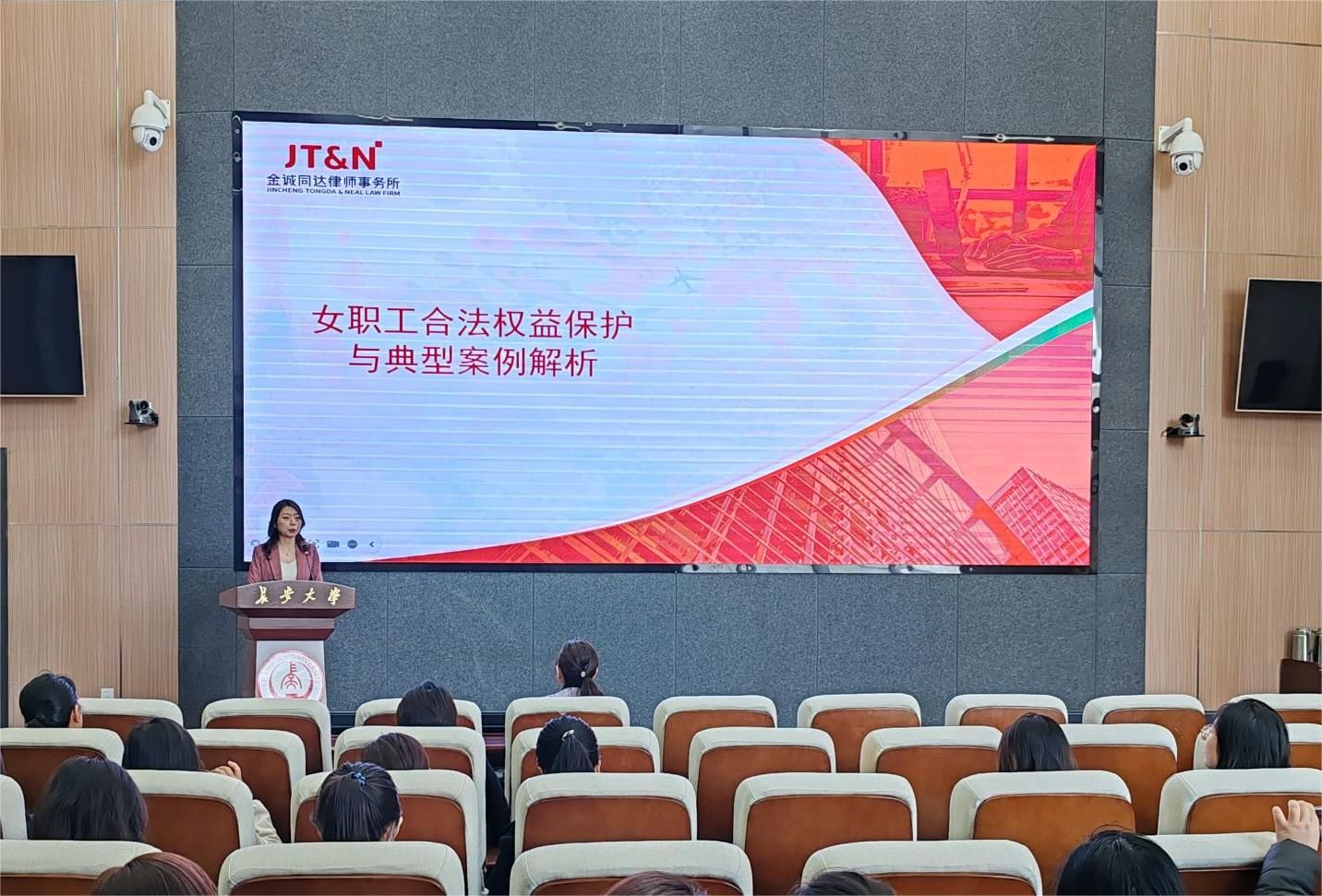 按照中华全国总工会《关于开展2024年女职工普法宣传活动的通知》精神,3月15日下午,bat365女教职工普法知识讲座在北校区服务大厅二层第二报告厅举行。此次讲座特邀陕西省司法厅行政规范性文件合法性审核和备案审查专家库成员、北京金诚同达(西安)律师事务所龚健律师担任主讲,各分会女工委员及女教职工代表一百余人聆听讲座。活动由校工会副主席范婷主持。