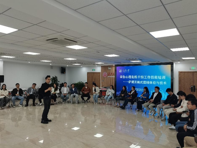 王凯通过体验式教学方法,以“大风吹”“幸运大轮盘”“我的人生大戏”等团体互动游戏为切入,帮助辅导员理解团体辅导活动的意义、流程、注意事项及技巧,通过讲解、演示、体验性互动的方式带领大家感受萨提亚体验模式的魅力。王凯指出,基于萨提亚理论体系构建的团体辅导技术在运用到学生心理危机干预工作中时,通过引导学生体验当下情绪情感、探索内心世界、正视眼前的困难与挫折、调整不合理认知等方式,建立积极体验,帮助学生走出迷茫,实现个人成长发展。