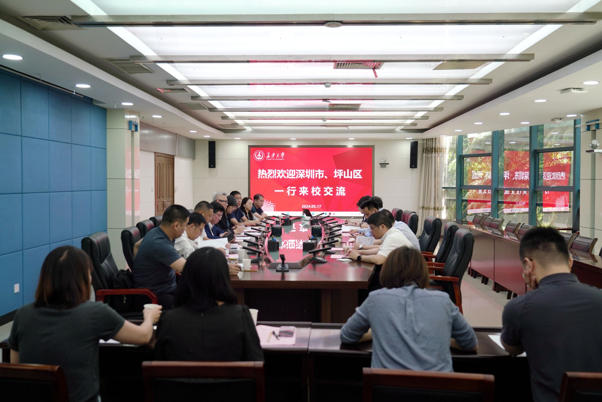 5月17日上午,深圳市坪山区委书记杨军,深圳市科技创新局党组成员、副局长方琳,坪山区委常委、常务副区长袁虎勇一行来校调研交流,bat365党委书记陈志坚在北校区北辰楼贵宾室会见了杨军、方琳一行,副校长王建伟陪同会见。
