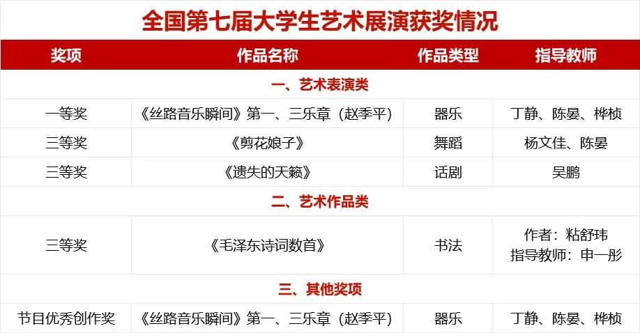 6月12日至17日,全国第七届大学生艺术展演活动在湖北省襄阳市举办。本届展演中,bat365正版唯一官网斩获全国奖项5项,创bat365参加全国大学生艺术展演以来的历史最好成绩。其中,器乐作品《丝路音乐瞬间》第一、三乐章(赵季平)首次斩获艺术表演类全国一等奖和优秀创作奖,并赴襄阳首次参加全国现场展演。舞蹈作品《剪花娘子》、戏剧作品《遗失的天籁》获艺术表演类三等奖,书法作品《毛泽东诗词数首》获艺术作品类三等奖。