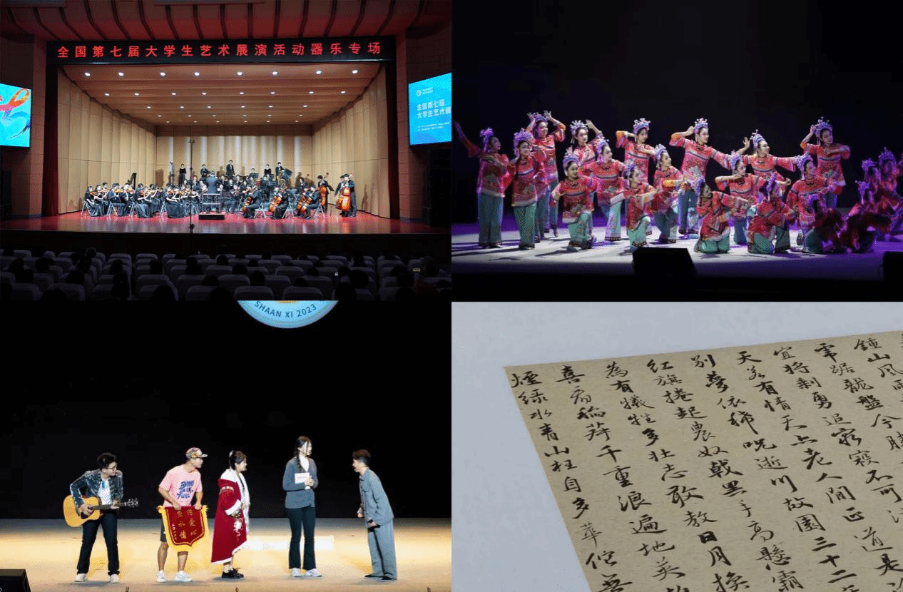 《丝路音乐瞬间》融合了东西方音乐的精髓,以丝绸之路为灵感,通过赵季平先生的妙笔,将千年的丝路文化历史与音乐完美融合。舞蹈《剪花娘子》取材于国家非物质文化遗产旬邑彩贴剪纸,表现了艺术家的不懈追求和传统剪纸艺术的魅力,展现了长大师生为传承和发扬传统文化所做的努力。话剧《遗失的天籁》讲述了大学生艺术团走进乡村小学,用音乐启迪孩子们心灵的故事,展现了艺术对育人的重要作用。行书条幅书法作品《毛泽东诗词数首》用书法形式展现了诗词中蕴含的丰富的艺术价值和深厚的思想内涵,既弘扬了中华传统文化和革命文化,也展现了深厚的家国情怀。