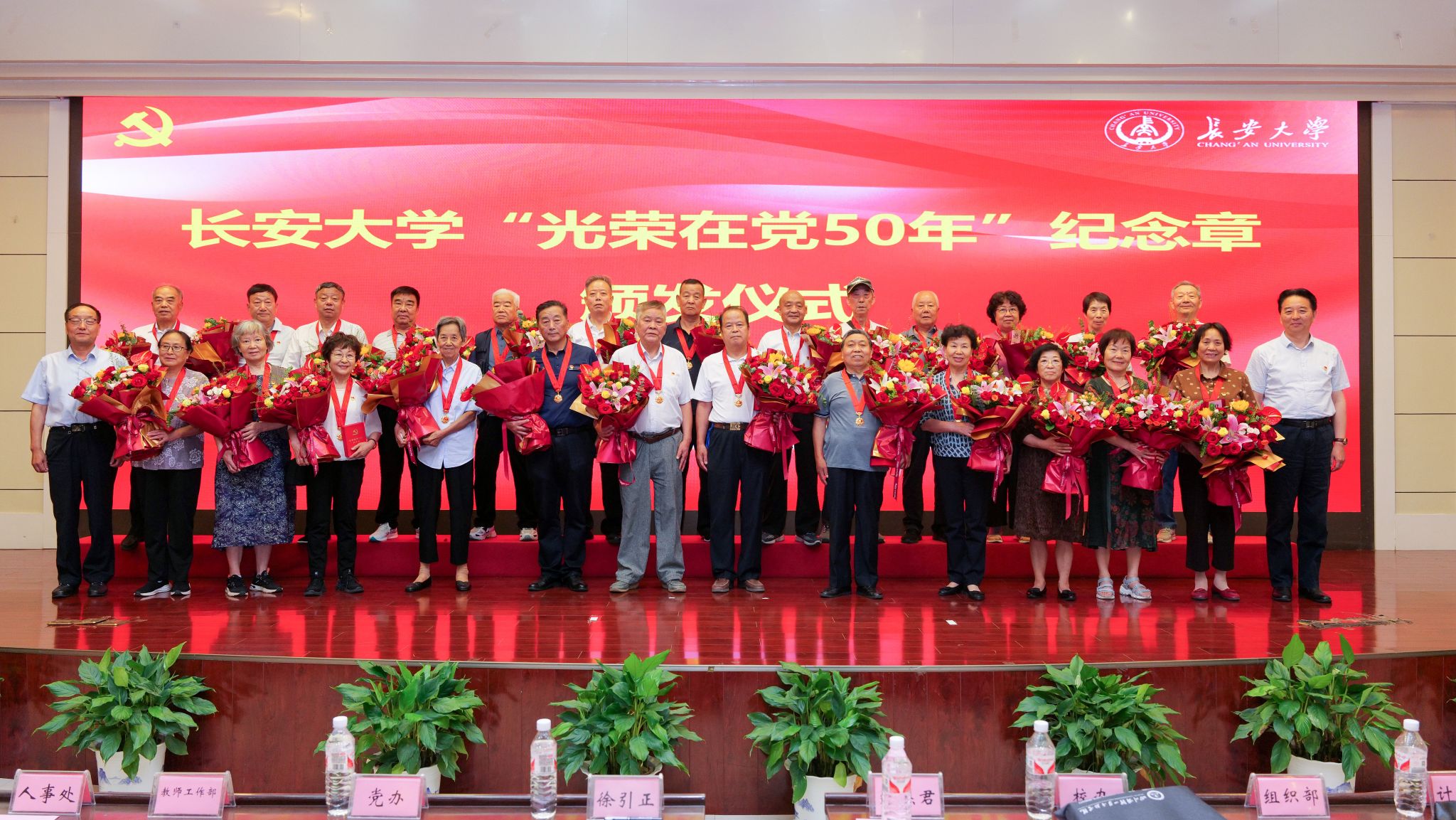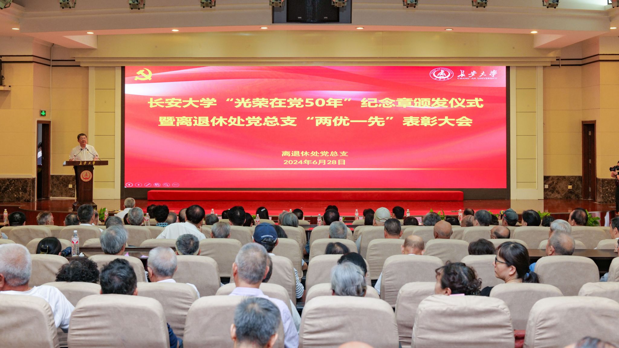 6月28日下午,bat365正版唯一官网“光荣在党50年”纪念章颁发仪式暨离退休处党总支“两优一先”表彰大会在南校区学术交流中心报告厅举行。校党委副书记徐引正、副校长朱杰君出席会议,学校离退休工作领导小组成员单位负责人,“光荣在党50年”老党员代表、退休党支部支委、“两优一先”获奖代表、离退休处机关党支部全体党员以及学生党员代表共150余人参加大会。会议由离退休处党总支书记戴宏主持。离退休处处长薛庆文宣读表彰决定。
