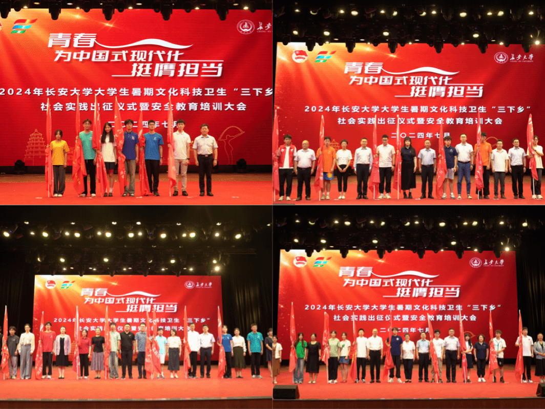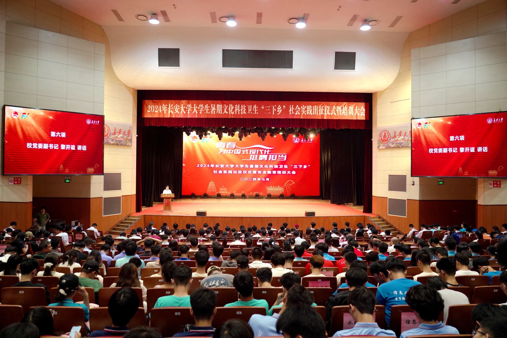 7月12日下午,学校2024年大学生暑期文化科技卫生“三下乡”社会实践出征仪式暨安全教育培训大会在北校区长安文化艺术中心大礼堂举行。校党委副书记黎开谊出席大会,宣传部、学工部、教务处、研工部、招就处、保卫处等部门相关负责人,各院(系)主管学生工作的院领导,校团委全体干部、各分团委书记,社会实践立项团队指导教师及队员代表参加大会。会议由校团委书记丁芝娟主持。