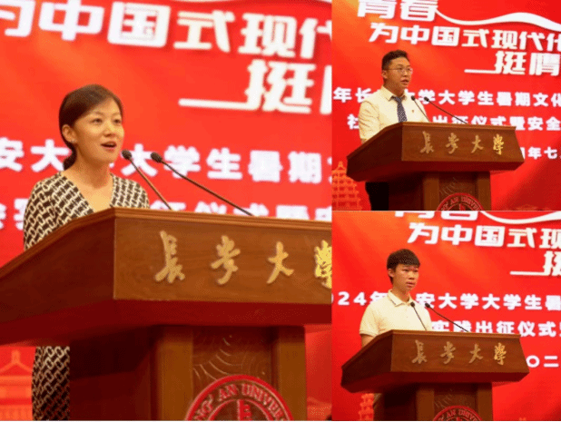 黎开谊为团中央、教育部、主题教育思政专项立项团队代表授旗,学校相关职能部门负责人为团学组织与学生社团立项团队代表授旗,各学院(系)主管学生工作的院领导为校级立项团队代表授旗。校团委副书记常睿对社会实践活动作了简要介绍和具体安排。指导教师代表马赛、实践队员代表欧文杰、实践队员代表留学生林桄正分别发言。