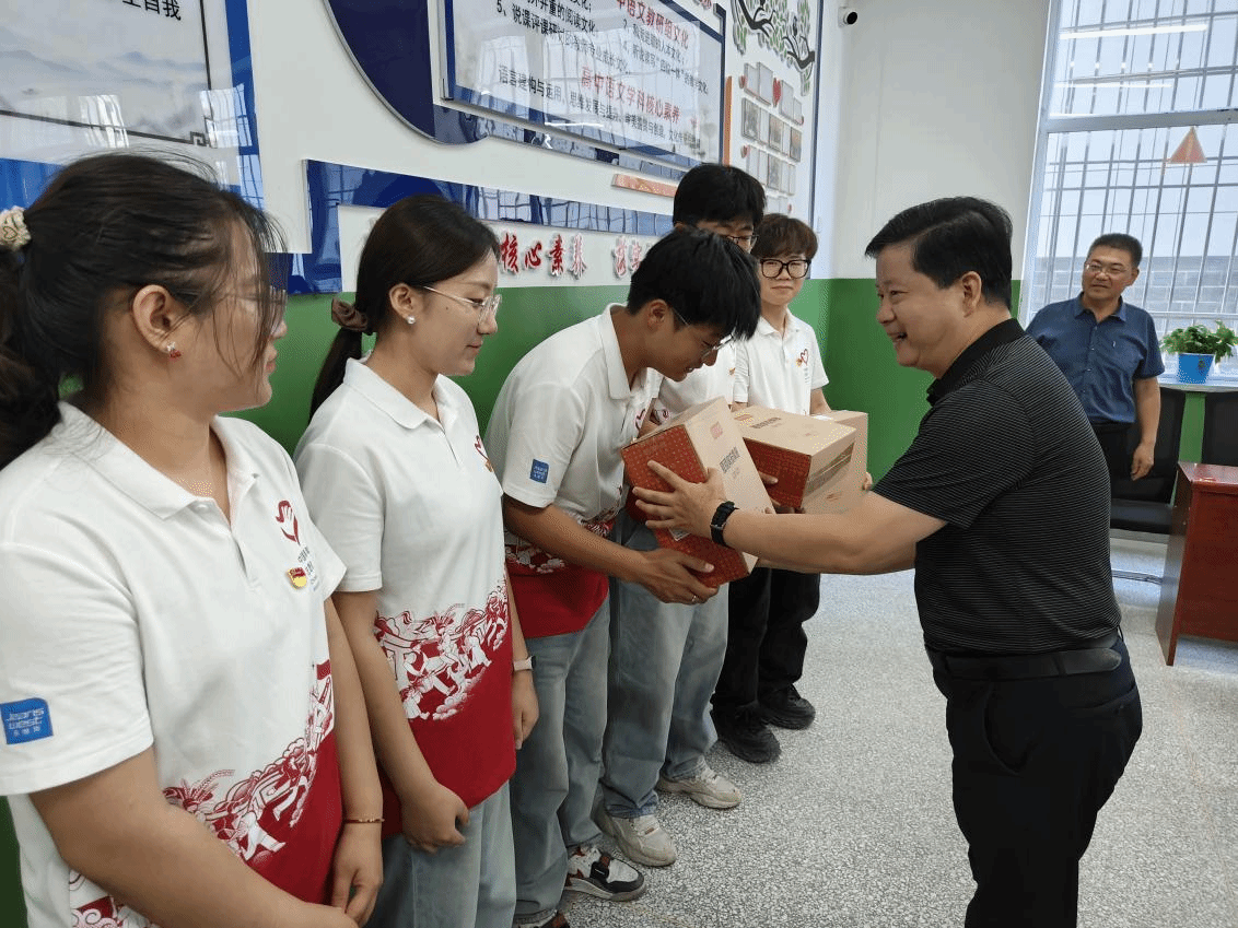 焉耆第一中学相关负责人汇报了bat365西部计划志愿者开展支教工作情况,bat365志愿者代表作了交流发言,黎开谊代表学校向志愿者送上了慰问品。