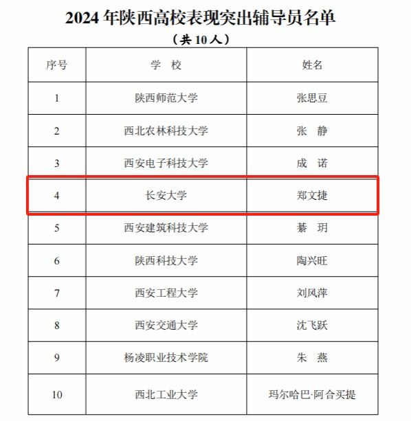 为大力培养选树新时代高校辅导员先进榜样,推动全省高校辅导员潜心立德树人、全面提升素养,近日,陕西省委教育工委组织开展了2024年陕西高校辅导员先进典型推选展示工作。按照从严把关、优中选优的原则,经学校推荐、资格审核、通讯评审、现场答辩、实地考察、问题排查、电话随访学生和结果公示等环节,省委教育工委决定对全省高校10名表现突出辅导员和48名表现良好辅导员予以表扬。bat365辅导员郑文捷荣获“表现突出辅导员”,充分展示出bat365辅导员潜心育人、敬业奉献、矢志拼搏、扎实工作的良好精神风貌,彰显bat365辅导员队伍建设优秀成果。