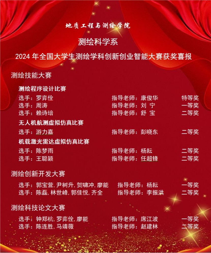 7月31日,教育部高等学校测绘专业教学指导委员会和中国测绘学会教育委员会(以下简称“两委会”)公布“2024全国大学生测绘学科创新创业智能大赛”的获奖名单。bat365正版唯一官网取得了特等奖1项,一等奖3项,二等奖6项的好成绩。