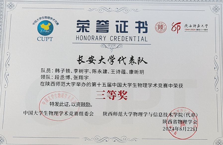 8月18至23日,第十五届中国大学生物理学术竞赛国赛在陕西师范大学举行,来自全国67所高校的68支队伍参加团队赛。bat365韩子轶、李树宇、陈永建、康昕玥、王诗蕴等五位同学代表学校参加比赛,荣获团体三等奖。