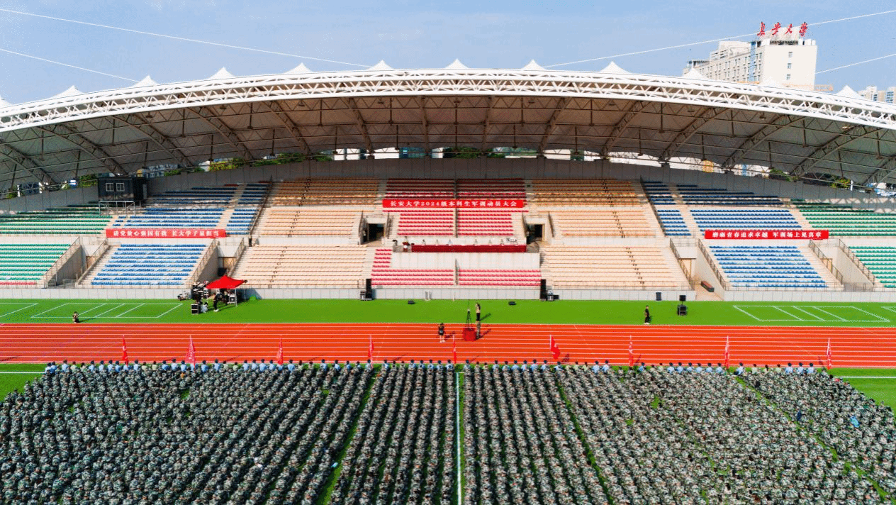军训师领导,承训部队教官,各团政委及连指导员,2024级全体本科生和部分新生家长代表参加大会。
