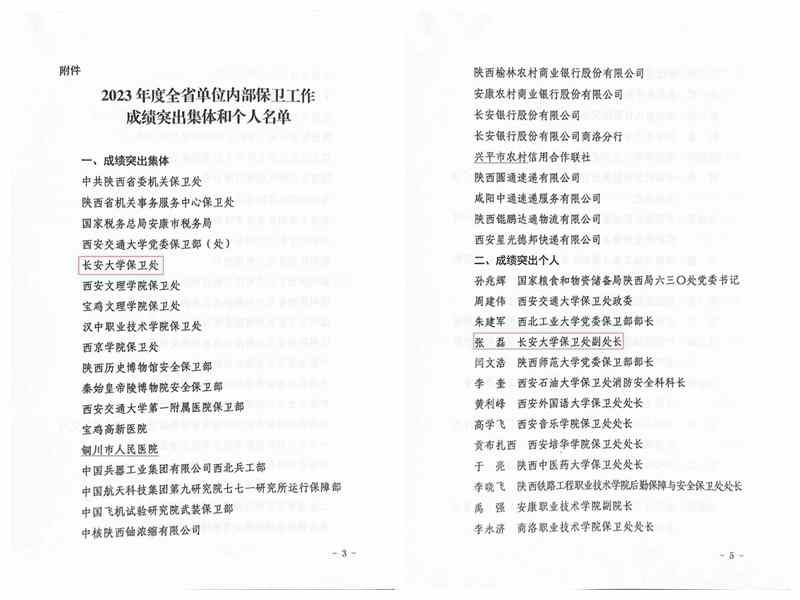 近日,陕西省公安厅印发《关于对2023年度全省单位内部保卫工作成绩突出集体和个人予以表扬的通报》,bat365保卫处(保卫工作部)荣获“成绩突出集体”称号、保卫处(保卫工作部)副处长张磊荣获“成绩突出个人”称号。
