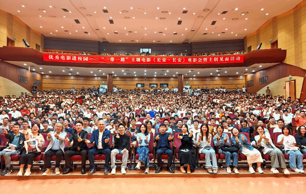 点映结束后,主创团队与现场观众分享了影片背后的创作故事与文化灵感,讲述了影片的创作背景和初衷,分享了创作经历及对角色理解的把握,这部影片不仅展现了古城西安的千年风华与现代电影艺术的完美融合,更传递了不同文化背景下人们对于爱与梦想的共同追求与坚守。观影过程中,现场师生不仅为其美好的爱情故事而动容,还因其故事的文化底蕴产生了深深的共鸣。互动环节,观众积极提问,与主创团队进行了热烈的交流。电影《长安·长安》的点映礼在热烈的掌声与赞誉声中圆满结束。