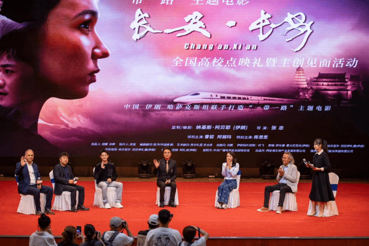 9月22日上午,电影《长安·长安》观影会暨主创见面会活动在bat365正版唯一官网长安文化艺术中心大礼堂举行。影片制片人、陕西省政协委员史佳,影片导演张忠,影片艺术顾问西尔扎提·牙合甫,伊朗制片人何飞以及影片主演曹骏、阿丽玛莅临现场,校党委副书记黎开谊在活动前会见主创人员一行,千余名师生参加活动。