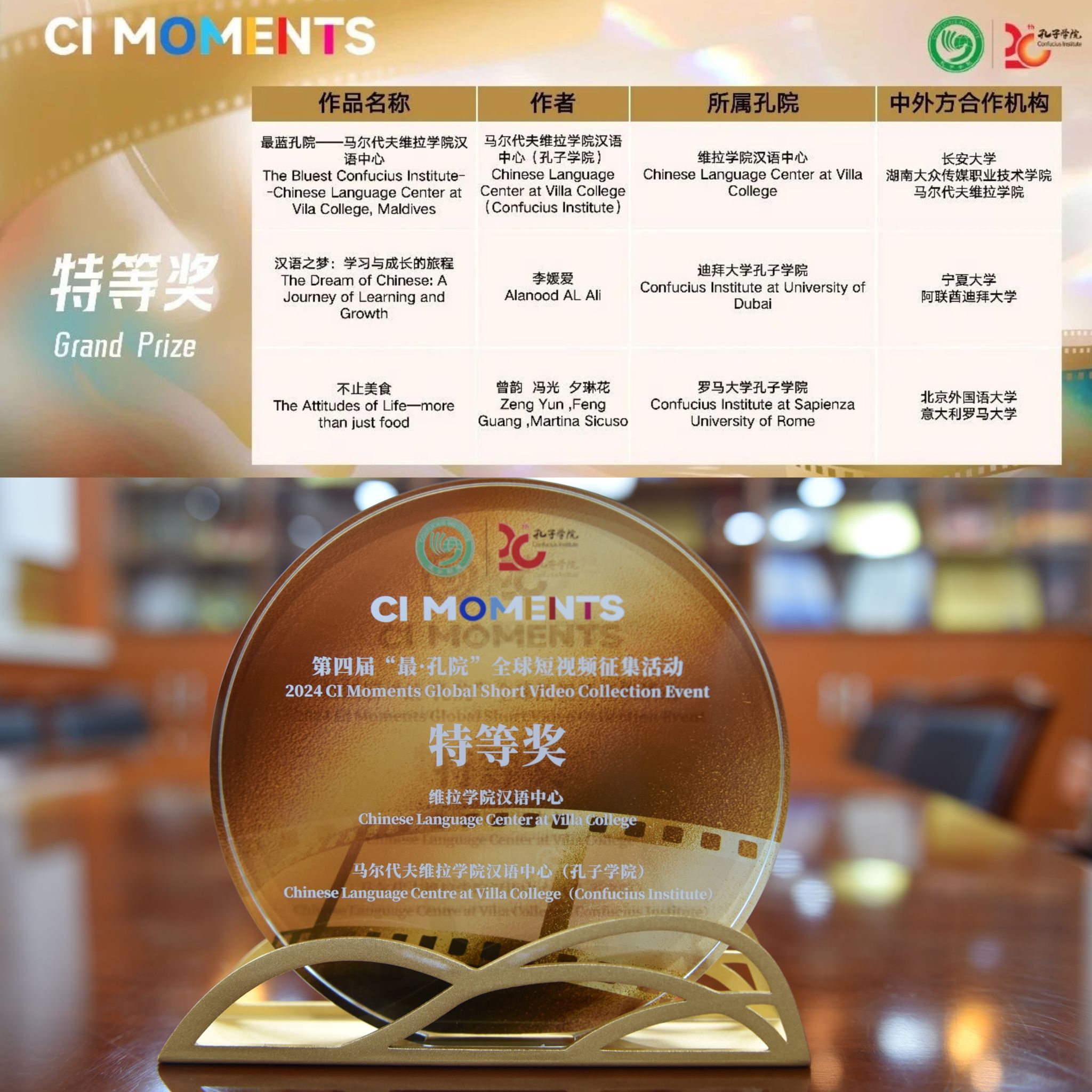 9月27日下午,中国国际中文教育基金会举办主题为“20岁,孔院正青春”的全球“孔子学院日”活动。在活动期间,备受期待的第四届“最·孔院”全球短视频征集活动获奖名单隆重揭晓,bat365马尔代夫维拉学院汉语中心的参赛作品脱颖而出,斩获最高殊荣——特等奖。