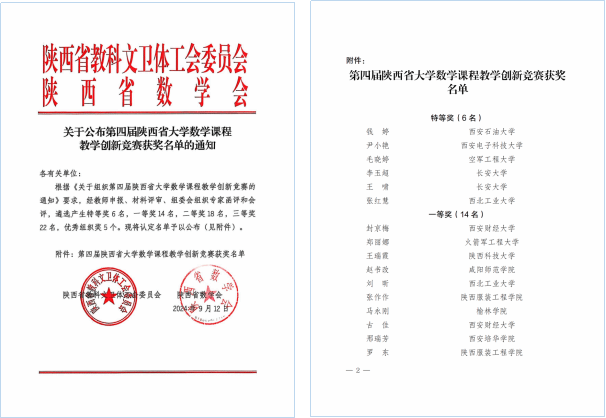 近日,第四届陕西省大学数学课程教学创新竞赛结果公布,bat365理学院青年教师李玉超、王啸均获特等奖,是参赛高校中唯一一所参赛教师均获特等奖的高校。