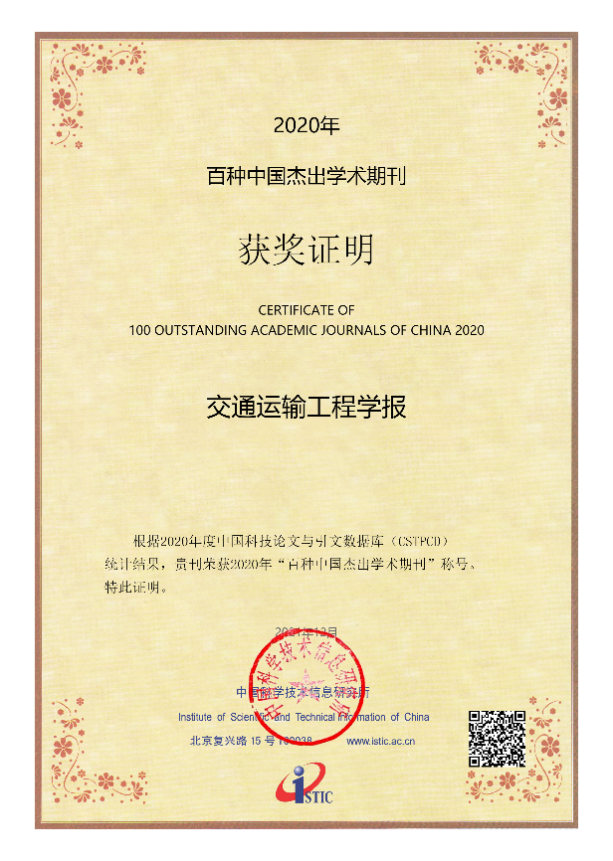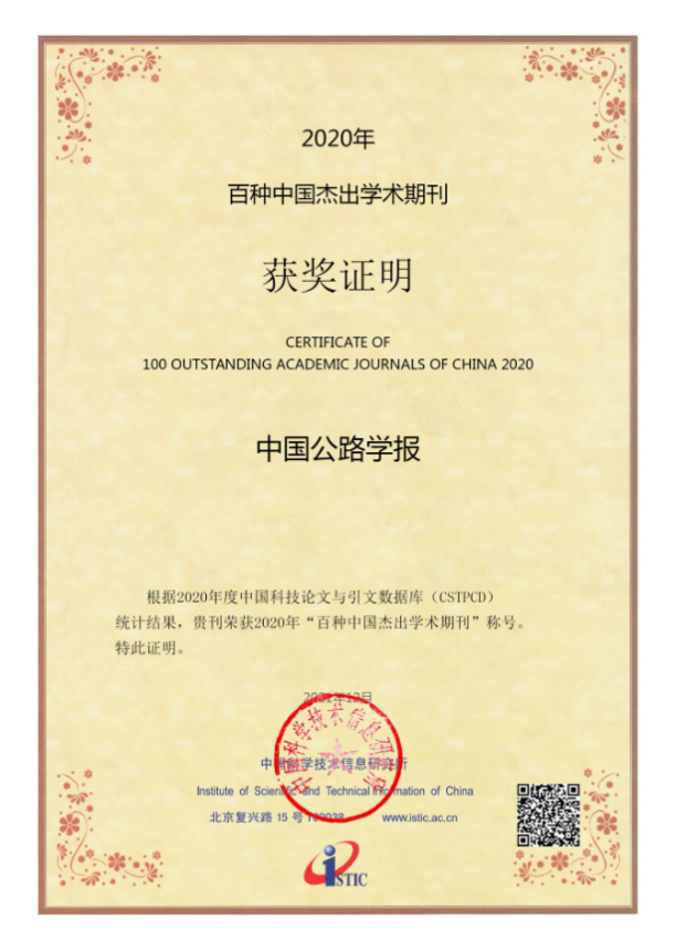 2021年12月27日,由中国科学技术信息研究所举办的“中国科技论文统计结果发布会”通过网络直播方式举行,公布了“2020年百种中国杰出学术期刊”评选结果。《中国公路学报》《交通运输工程学报》入选“2020年百种中国杰出学术期刊”,分别是两大学报第16、13次获此殊荣。