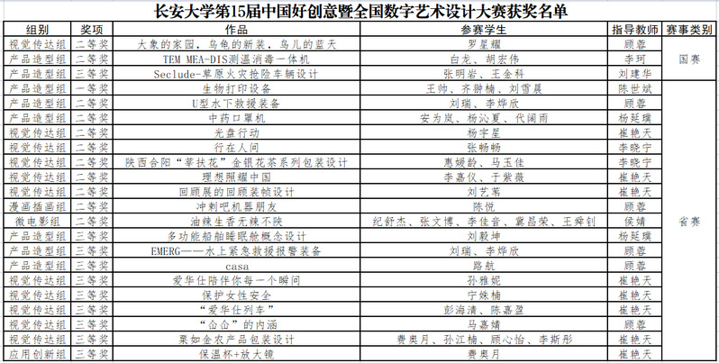 11月20日,第15届中国好创意暨全国数字艺术设计大赛结果公布,bat365选送的作品共获得国家级二等奖2项、三等奖1项,省级一等1项、二等奖9项、三等奖9项,学校获优秀组织奖,机械学院顾蓉、人文学院崔艳天获优秀指导教师奖。