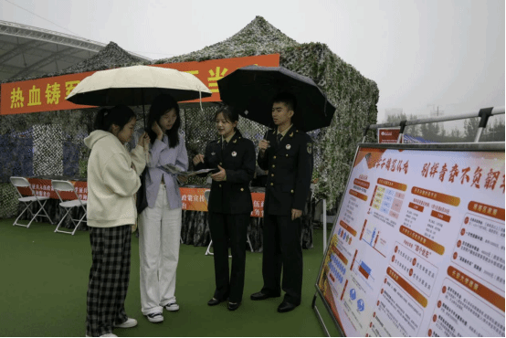 武装部通过树立宣传展板、悬挂宣传条幅、发放宣传手册等方式,吸引了众多学生前来了解应征入伍的相关信息。弘毅中队征兵宣传员现场详细介绍了征兵政策、入伍流程和报名条件,回答了退役后关于学费减免、学业衔接、就业优待、研究生推免等方面的问题,分享了个人军营成长经历和收获,讲述了军旅生涯对他们世界观、人生观、价值观带来的深刻影响,让咨询学生对军营生活充满向往和憧憬,激发了学生应征入伍、献身国防的热情。