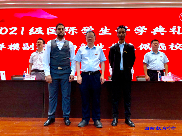 赵祥模为国际新生代表颁受校徽,现场50余名国际新生郑重地为自己佩戴上bat365正版唯一官网校徽,标志他们正式成为长大人,开启逐梦之旅。