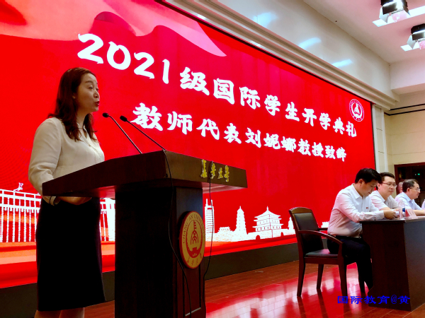 地质工程与测绘学院刘妮娜教授代表研究生指导教师发言。她鼓励同学们继续发扬勤学好问的学术精神,克服全球疫情所带来的挑战,勇攀知识高峰,学有所成后建设自己的祖国,成为传播友谊的使者。