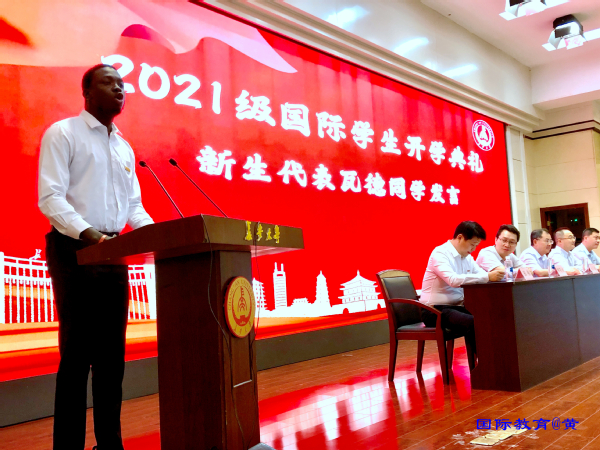 公路学院2021级研究生、塞内加尔籍瓦德代表全体新生向学校庄严承诺:努力学习、不断进取,遵守中国法律法规、尊重中国文化、做各国友好交流的使者。
