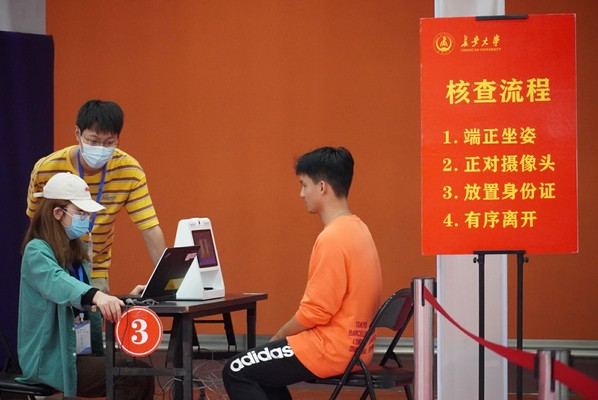 新生“人像比对”技术核查是新生入学资格复查、确保新生入学资格真实有效的重要工作环节。本次核查通过将现场采集的照片与本人高考录取照片、身份证照片进行技术比对,精确核验新生身份。在核查现场,8个工作台同步进行核验,经过培训的近20名工作人员参与此次工作。由于准备充分,培训到位,照片采集核验工作组织规范,有序高效,按计划顺利完成工作任务。同时,根据疫情防控要求,各学院(系)加强领导,周密安排,组织学生分时段、分批次,佩戴口罩并保持安全距离进行现场核查。
