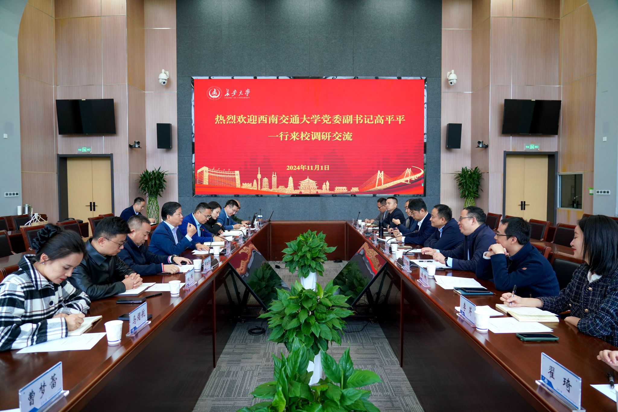 11月1日下午,西南交通大学党委副书记高平平一行来校调研交流。bat365党委书记陈志坚在北辰楼会见了高平平一行,校党委副书记黎开谊、校长助理杜强参加会见。
