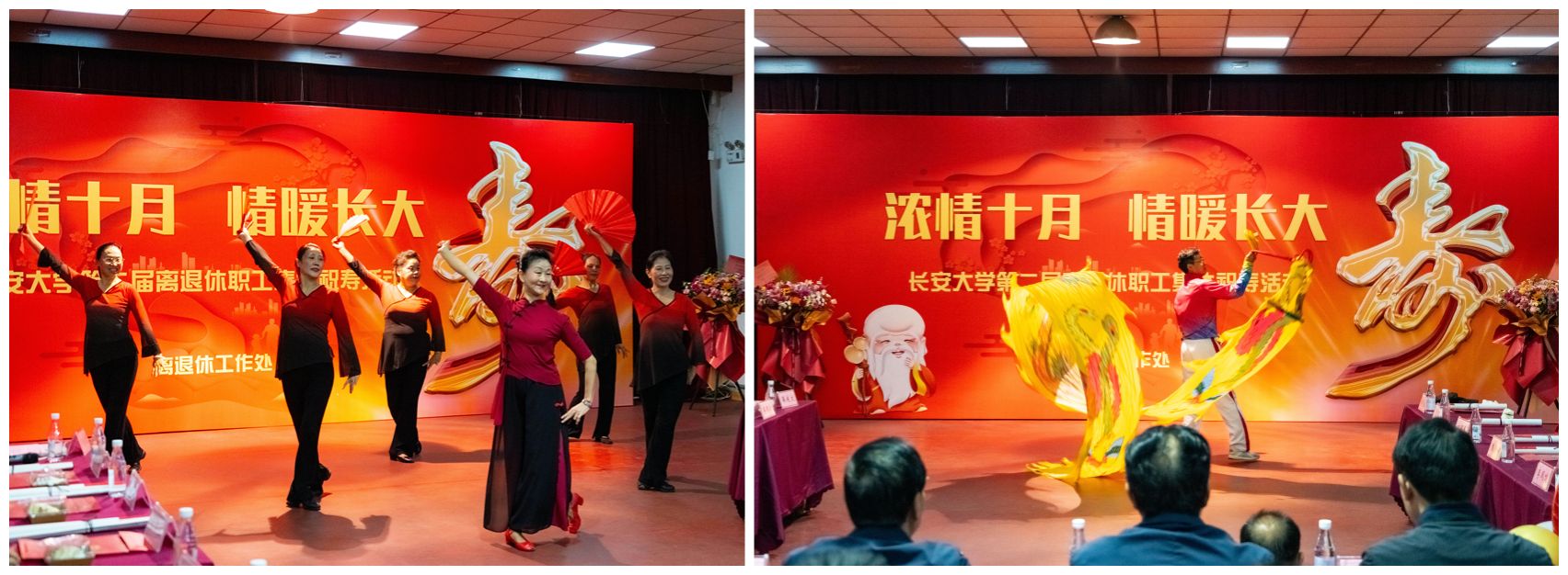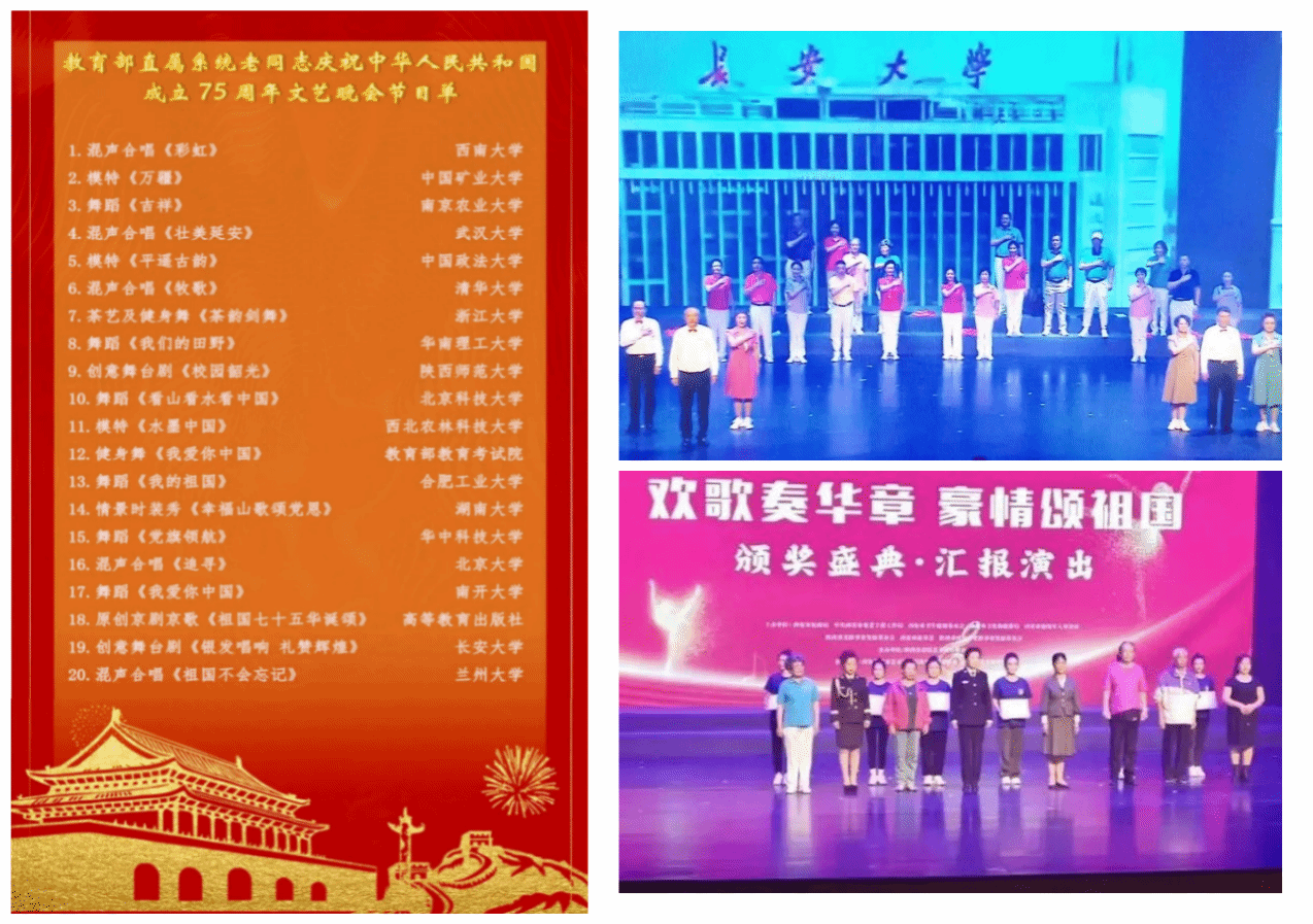 文化养老享银龄,丰富活动展风采。艺术团创作的舞台剧《银发唱响礼赞辉煌》于10月29日在教育部直属系统老同志庆祝中华人民共和国成立75周年文艺晚会上展播,《银发礼赞》节目获得“西安市第七届老年大舞台”比赛三等奖,并应邀参加“西安第七届老年欢歌奏华章豪情颂祖国颁奖盛典•汇报演出”。举办“庆祝新中国成立75周年”暨敬老孝亲文化书画展、迎国庆暨敬老文化摄影展,展出老同志创作的书画作品和摄影作品,描绘祖国繁荣富强的光辉历程,讴歌新中国成立75年来取得的伟大成就。开展丰富多彩、形式多样的文体活动。组织500余名离退休职工观看红色电影《志愿军:存亡之战》和歌剧《大汉苏武》,吸引2400余名老同志参加校园健步走、跳棋友谊赛、投壶和扔沙包等项目,引导老同志热爱生活、增强健康意识。