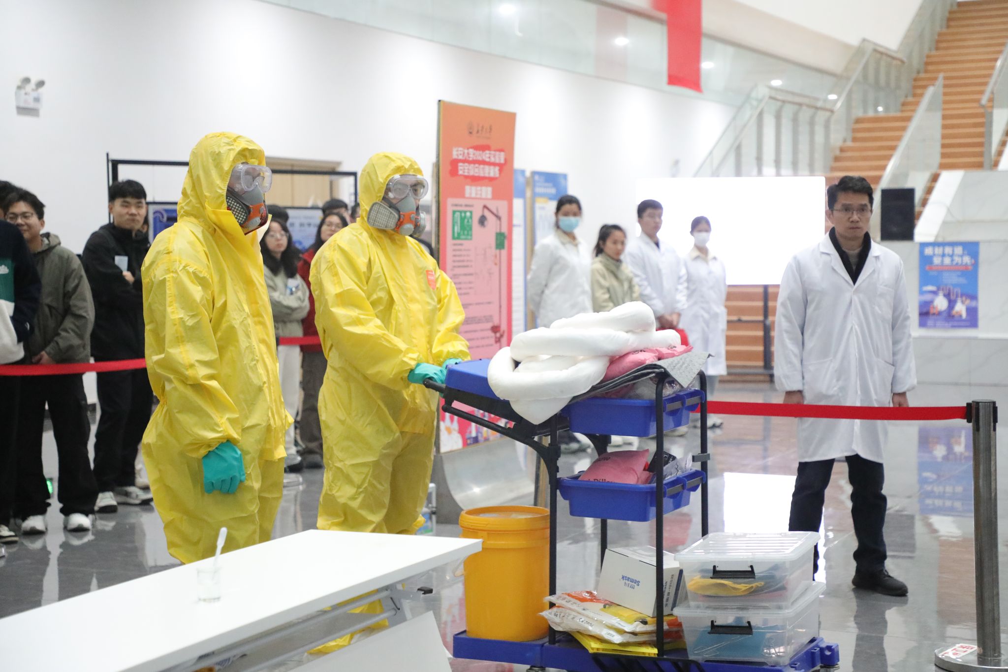 演练现场,师生观摩了由材料学院师生演示的实验室危化品泄漏、危化品皮肤接触等突发应急事故的处置演练,并在保卫处指导下进行了灭火器使用训练。