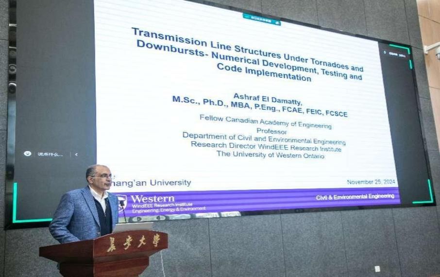 会上邀请了加拿大工程院院士Ashraf El Damatty作题为“Transmission Line Structures Under Tornadoes and Downbursts - Numerical Development, Testing and Code Implementation”的报告。El Damatty提到,超过80%的与下击暴流和龙卷风天气有关的输电线路故障与HIW事件有关。他指出,将模拟的下击暴流和龙卷风风场与非线性有限元结合,可以对输电线路的工作性能进行数值分析。在此基础上,依托建立的数值模型开展参数分析,可以评价拉线塔和自立式格构塔在下击暴流和龙卷风作用下的工作效能。此外,通过对输电塔-线体系进行失效分析,可以预估失效荷载和失效模式。最后,El Damatty对于在WindEEE实验室开展的下击暴流和龙卷风作用下的输电塔-线体系气弹模型试验的基本情况进行了介绍。