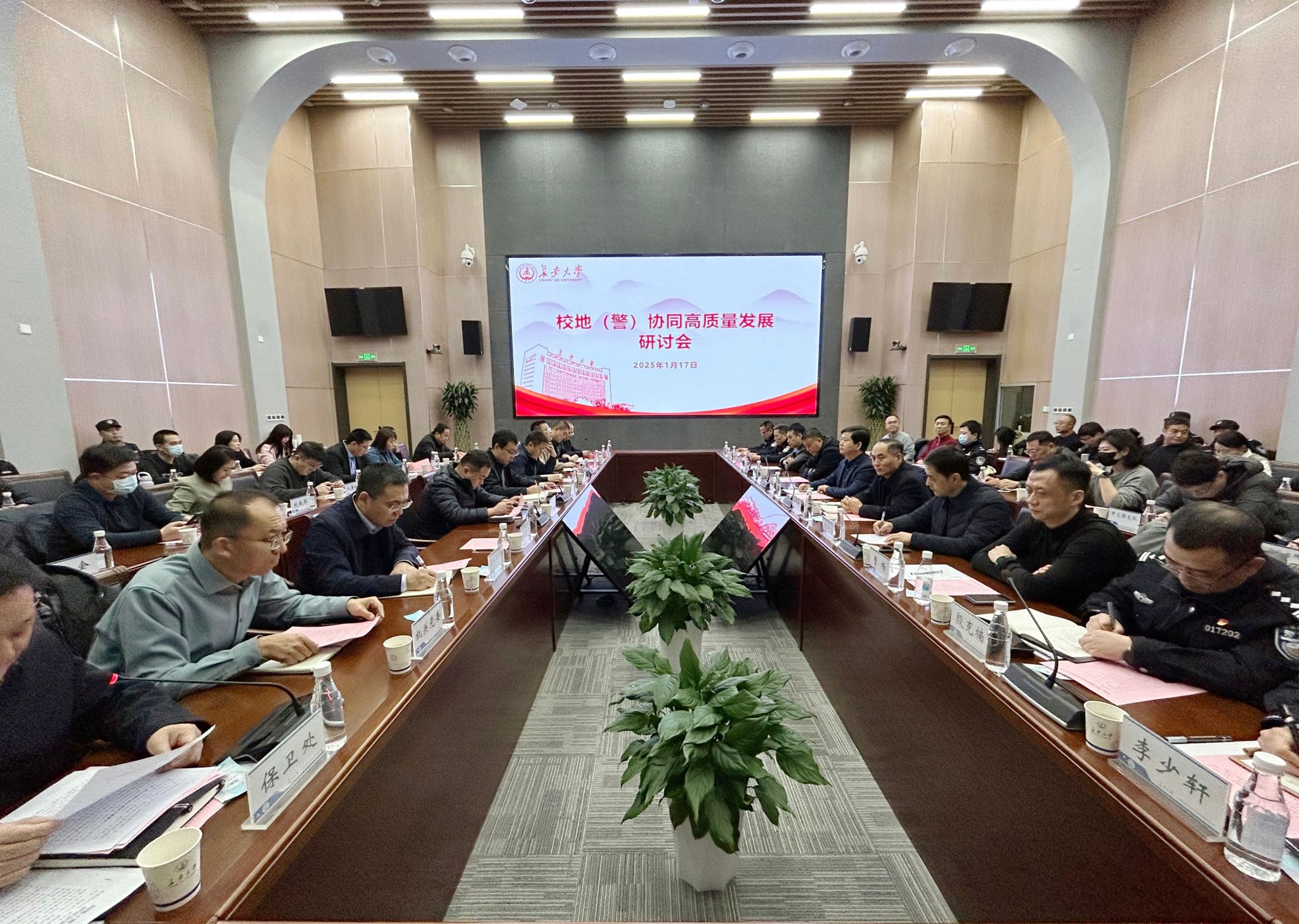 1月17日下午,学校召开校地(警)协同高质量发展研讨会。省委教育工委稳定办主任任正旺、校党委副书记黎开谊、省公安厅经文保总队副总队长钟晓朝、市公安局文保支队副支队长颜军宁、市公安局文保支队四大队大队长曹杨、公安未央分局国保大队大队长李鹏、小寨路派出所所长李刚、育才路派出所所长樊锋、汉城派出所所长殷克楠、尚稷路派出所副所长李少轩出席会议。会议由保卫处政委石瑞平主持。