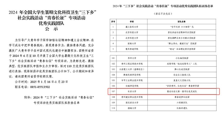 据悉,全国大学生暑期文化科技卫生“三下乡”社会实践活动“青春长征”专项活动自2024年6月开展以来,经实践团队申报和主办方审核,拟对110支优秀实践团队进行表扬。该项活动旨在引导广大青年学子深学细悟长征精神和遵义会议精神,在学习成长中把牢青春航向、展现青春作为、激扬青春风貌,充分激发广大青年学子在中国式现代化建设中挺膺担当。