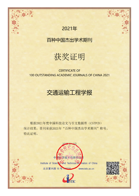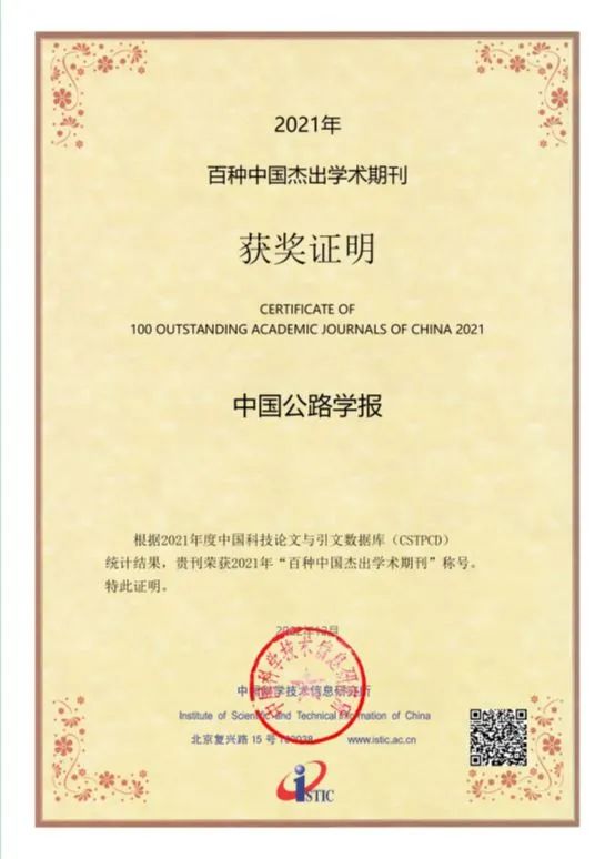 12月29日,中国科学技术信息研究所通过网络直播方式举行“中国科技论文统计结果发布会”,公布了“2021年百种中国杰出学术期刊”评选结果。《中国公路学报》《交通运输工程学报》入选“2021年百种中国杰出学术期刊”,分别是第17、14次获此殊荣。