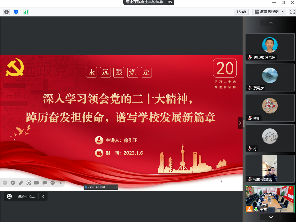 为深入学习宣传贯彻党的二十大精神,1月6日下午,校党委副书记徐引正以《深入学习领会党的二十大精神,踔厉奋发担使命,谱写学校发展新篇章》为题作党的二十大精神宣讲报告。报告会由校党委常委、统战部部长王耀文主持。