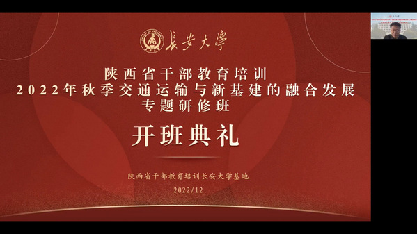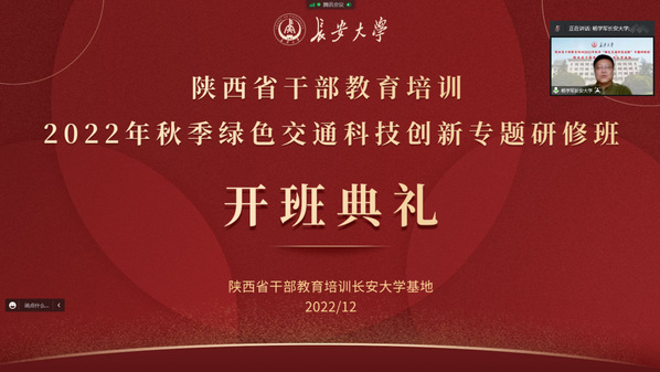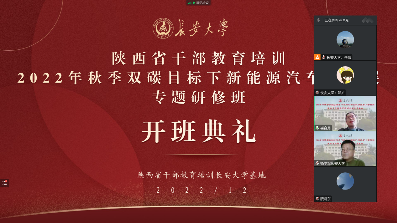 12月19日至21日,由陕西省委组织部主办、陕西省干部教育培训bat365正版唯一官网基地承办的2022年秋季交通运输与新基建的融合发展专题研修班、绿色交通科技创新专题研修班、双碳目标下新能源汽车的发展专题研修班,分别举行线上开班仪式。bat365党委常委、组织部部长李文雄,继续教育学院副院长杨学军分别出席了开班仪式,省市区(县)有关部门、企业的领导干部共110余人参加了培训。