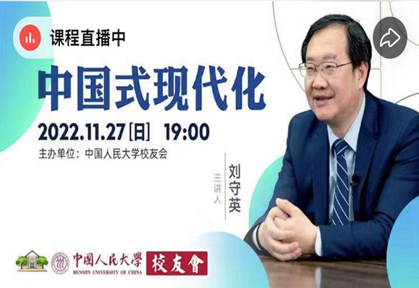 中国人民大学刘守英教授以《中国式现代化》为题,围绕现代化、中华民族谋求现代化进程与内涵扩展、中国式现代化的共同特征和独特性三个方面,从历史逻辑、理论逻辑和实践逻辑三个角度对党的二十大报告中提出的中国式现代化进行了诠释和解读。刘守英教授表示,现代化是人类历史上最剧烈、最深远、最彻底的社会变革,中国共产党是中国式现代化的领导力量,中国共产党通过制度变革推动中国现代化,开创了社会主义现代化的新境界。牢牢把握新时代新征程党的使命任务,必须深入理解和把握中国式现代化的本质要求,不断巩固全国各族人民大团结,加强海内外中华儿女大团结,形成同心共圆中国梦的强大合力,以中国式现代化全面推进中华民族伟大复兴。