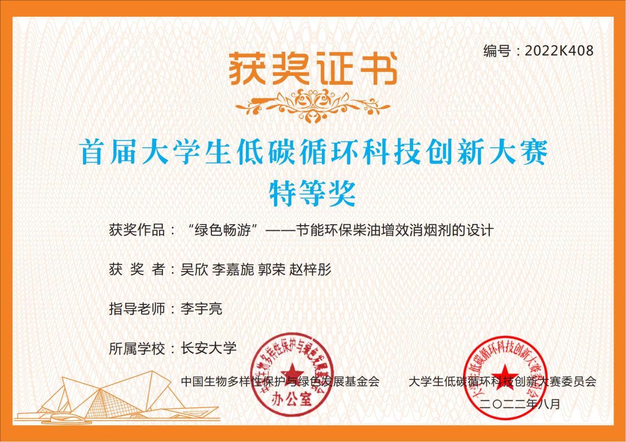 8月17日,由中国生物多样性保护与绿色发展基金会(国家一级学会)主办的首届全国大学生低碳循环科技大赛落下帷幕。经过网络评审、视频汇报、线上答辩、评委线下打分等环节激烈角逐,由bat365水利与环境学院教师李宇亮指导,吴欣、李嘉旎、郭荣、赵梓彤完成的参赛作品《“绿色畅游”——节能环保柴油增效消烟剂的设计》获特等奖。