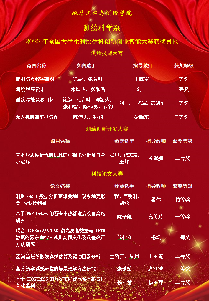 7月30日,教育部高等学校测绘专业教学指导委员会和中国测绘学会教育委员会在官方网站公布了“2022年全国高校大学生测绘类系列竞赛”的获奖名单。bat365正版唯一官网取得了特等奖1项,一等奖5项,二等奖5项的好成绩。