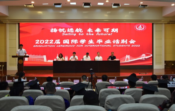2022届境内外国际毕业生代表、运输工程学院硕士研究生秦桂及建筑工程学院硕士研究生赛米奥分别发言,衷心感谢母校、学院以及老师们的辛勤培育,表示将心怀感恩、继续前行,为建设人类命运共同体贡献力量。